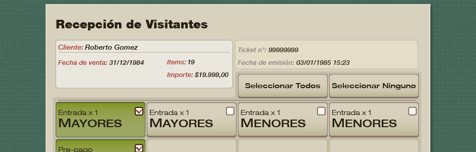 Gracias a este producto, puede recibirse a los visitantes que han comprando sus entradas on-line de una forma ágil y sencilla. Asimismo, el sistema de recepción se articula con el de ventas para proveer información útil sobre la forma y los plazos en los que la gente compra sus entradas y accede al predio.